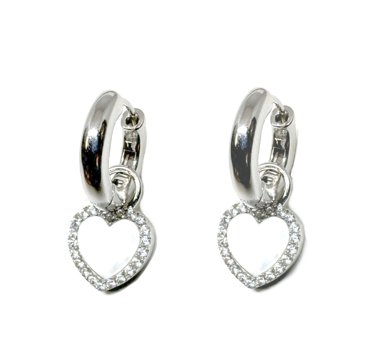 Hopeiset saranoidut korvarenkaat, joissa irroitettava sydän-riipus. Kaunista helmiäis-sydäntä ympäröi kirkkaat säihkyvät zirkoniat.