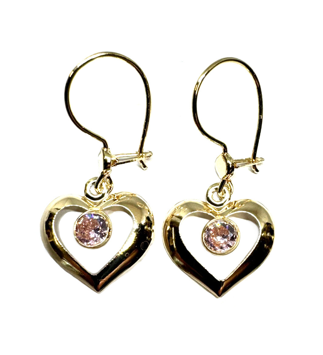 Keltakultaisissa Sydän-korvakoruissa on koukkukiinnitys ja sydämen keskellä umpisarjaan kiinnitetty vaaleanpunainen zirkonia.