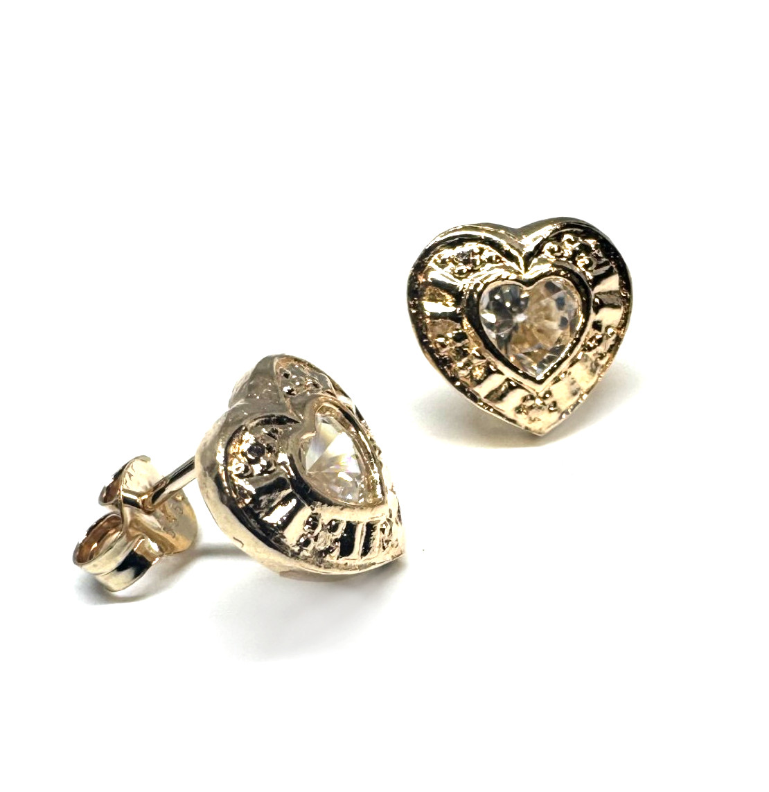Keltakultaisissa Sydän-korvakoruissa on keskellä kirkas iso zirkonia. Korvakorut on tehty valamalla ja sydämen koko on 9 x 8 mm.