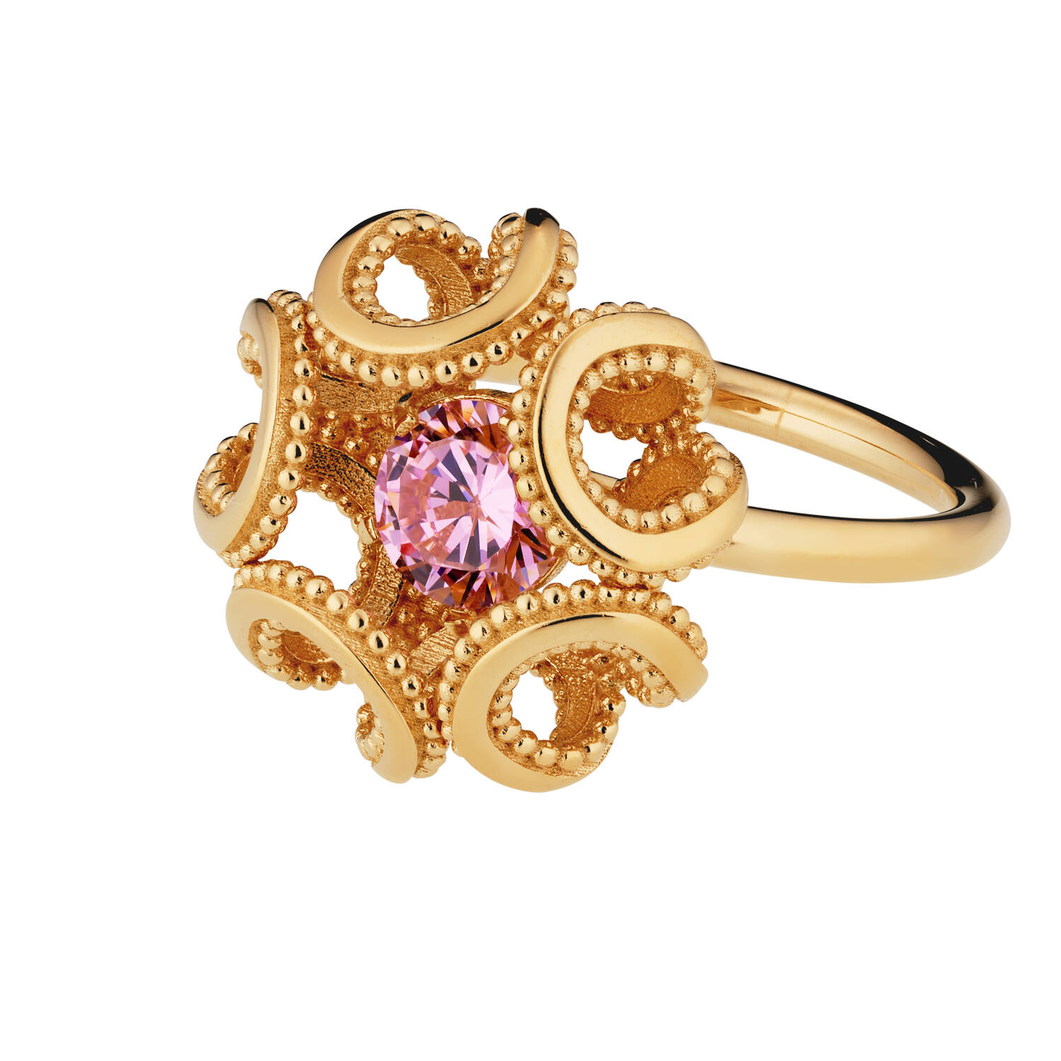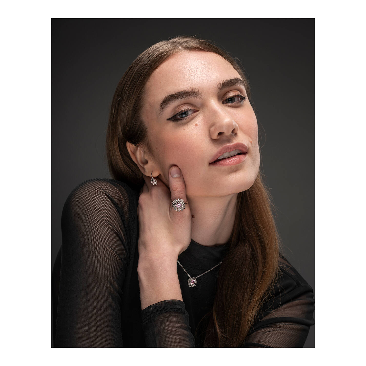 Alma tuo perinteikkään viktoriaanisen muotokielen tähän päivään koristeellisen muodon ja pitsimäisten yksityiskohtien kautta. Tarkasti keskiöön asetettu vaaleanpunainen kivi korostaa korun kerroksellisuutta ja muuttaa herkän kokonaisuuden kiinnostavaksi. Almassa minimalismi ei tarkoita yksinkertaisuutta ja maksimalismi ei tarkoita liikaa.