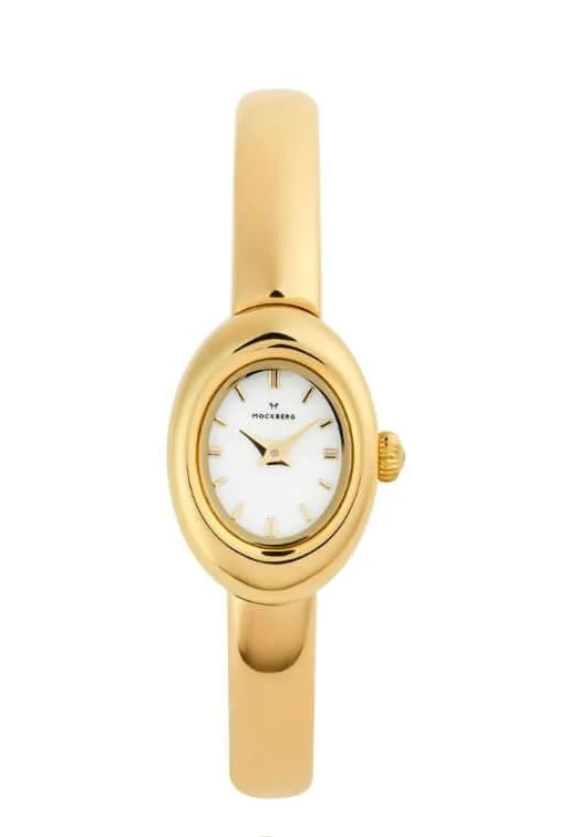 Mockberg MB1769 on klassinen ja ajaton asuste kaikkiin tilanteisiin. Ovaali korukello on kokonaan kullanvärinen ja siro, halkaisijaltaan vain 18,5mm. Rannekkeena toimii upea rannerengasmainen ranneke joka aukeaa saranoituna kellotaulun vierestä