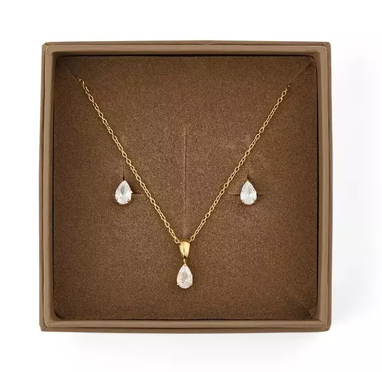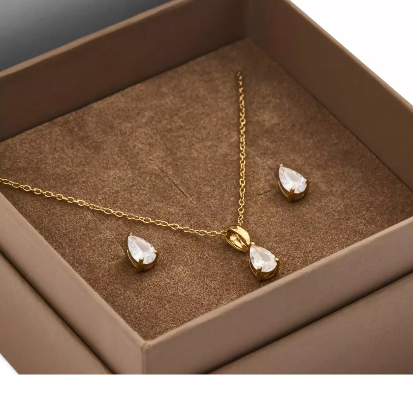 Tyylikäs kullanvärinen teräksinen kaulakoru, jossa 18 karaatin PVD-kultapinnoitus ja upea pisaranmallinen kirkas zirkonia-riipus. Settiin kuuluu myös zirkonia-korvakorut.