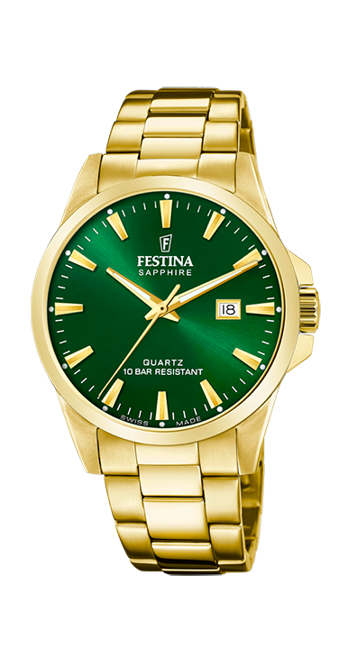 Festina Swiss made F20044 /5 on tyylikäs miesten kullanvärinen rannekello, siinä on upea vihreä kellotaulu.