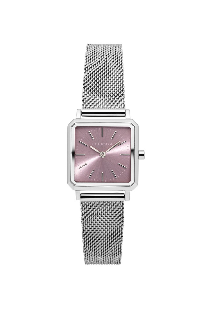 Leijonan tyylikäs hopeanvärinen teräksinen rannekello, jossa kantikas vaaleanpunainen kellotaulu.