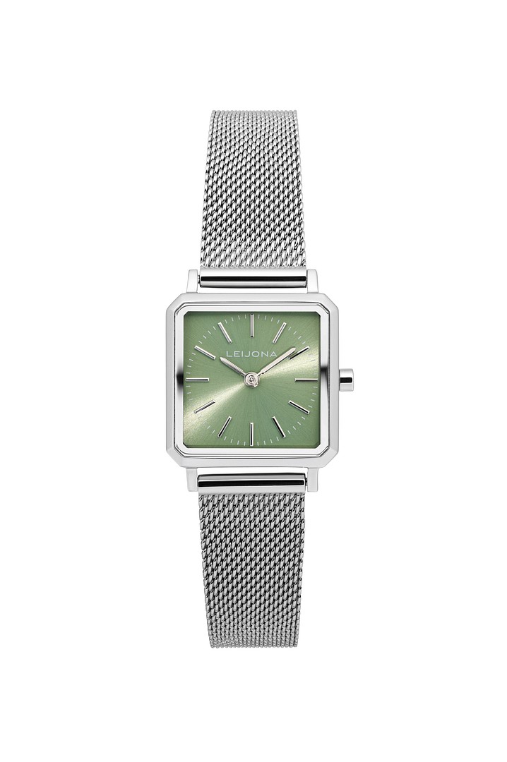 Leijonan tyylikäs hopeanvärinen teräksinen rannekello, jossa kantikas vihreä kellotaulu.