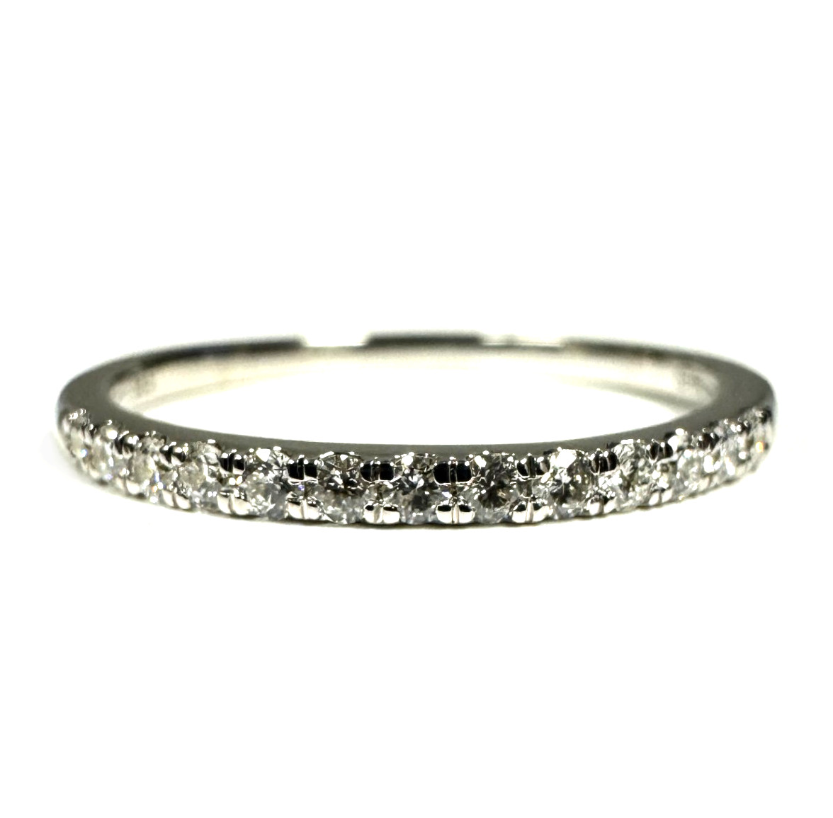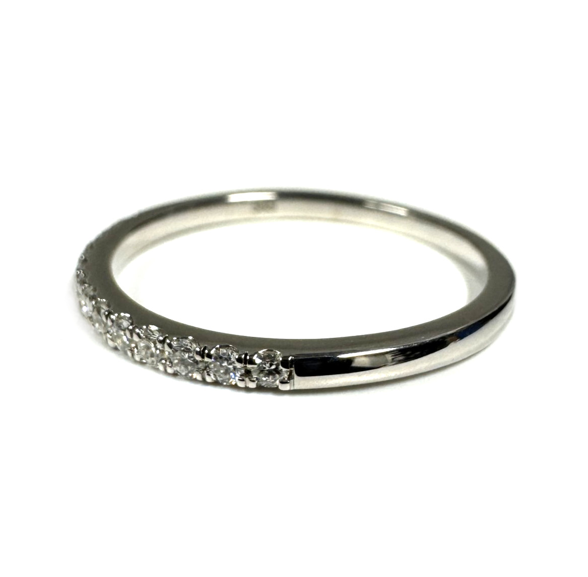 Kaunis ja klassinen valkokultainen timanttisormus jossa rivissä yhteensä kolmetoista timanttia, jotka istutettu raeistutuksena. Sormuksen runko on tasapaksu.
