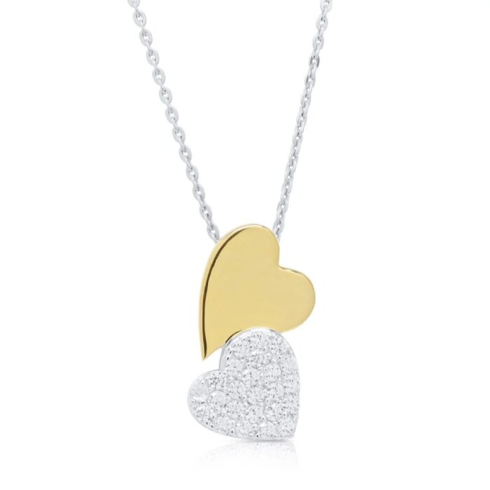 Tuplasydän-riipuksessa on kaksi sydäntä joista toinen on kullattu ja toinen istutettu täyteen kirkkaita zirkonioita.