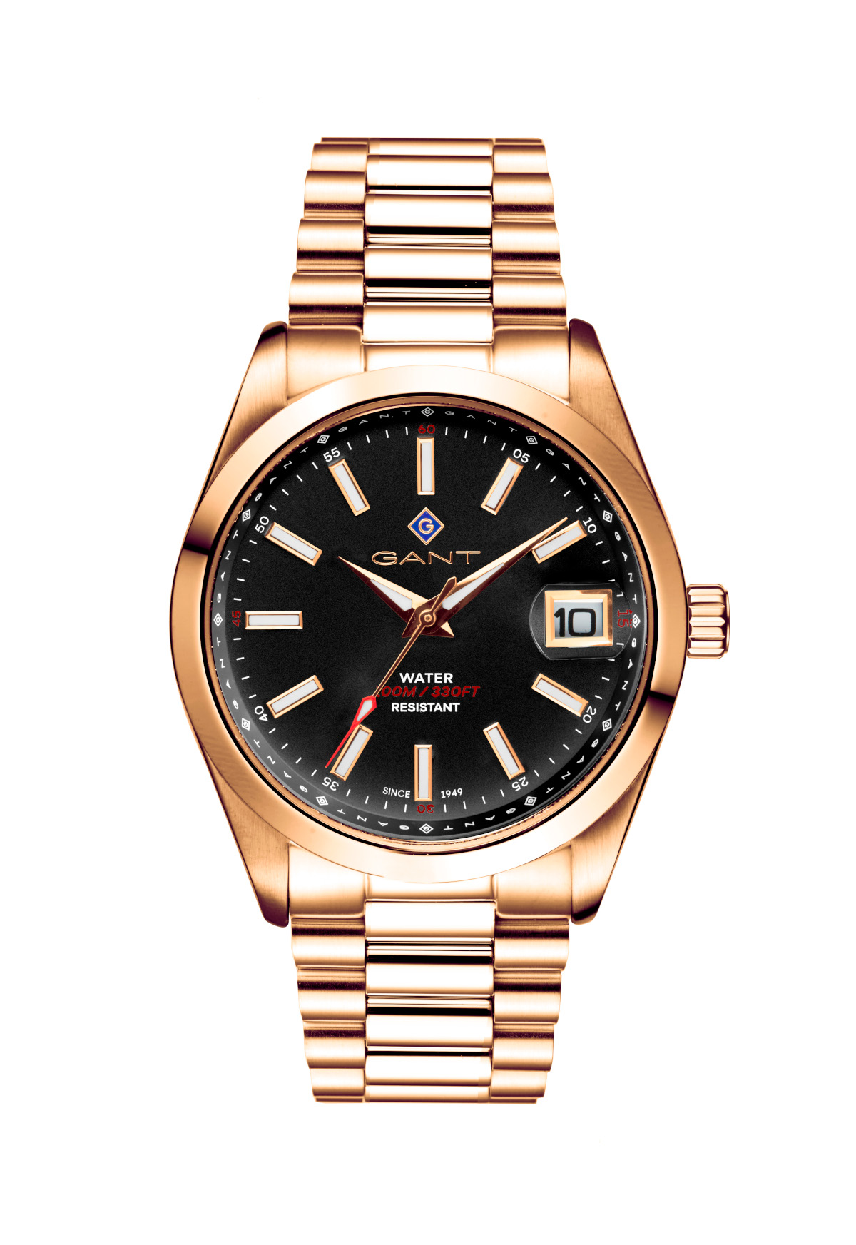 Gant Eastham G161014 on tyylikäs miesten rannekello, jossa on kullanvärinen ruostumattomasta teräksestä valmistettu runko ja ranneke. Mineraalilasin alla suojassa on selkeä musta kellotaulu.