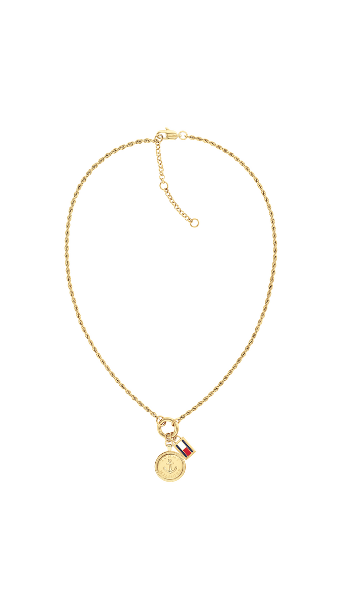 Tommy Hilfiger upea teräksinen kaulakoru, jossa kullanvärisessä cordel-ketjussa keskellä ankkuri-teemainen amuletti-riipus.