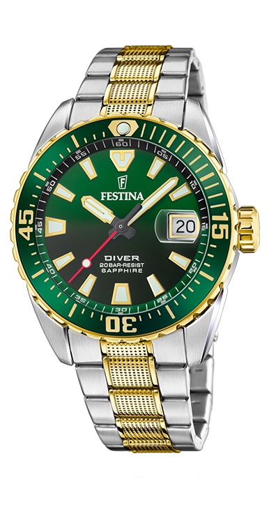 Festina rannekello F20706/2 on tyylikäs miesten rannekello, jossa on 41 mm leveä runko, kaksivärinen näyttävä teräsranneke sekä vihreä kellotaulu vihreällä kehällä. Tämä Festina soveltuu laitesukellukseen, sillä sen vesitiiviys on 200m / 20atm.