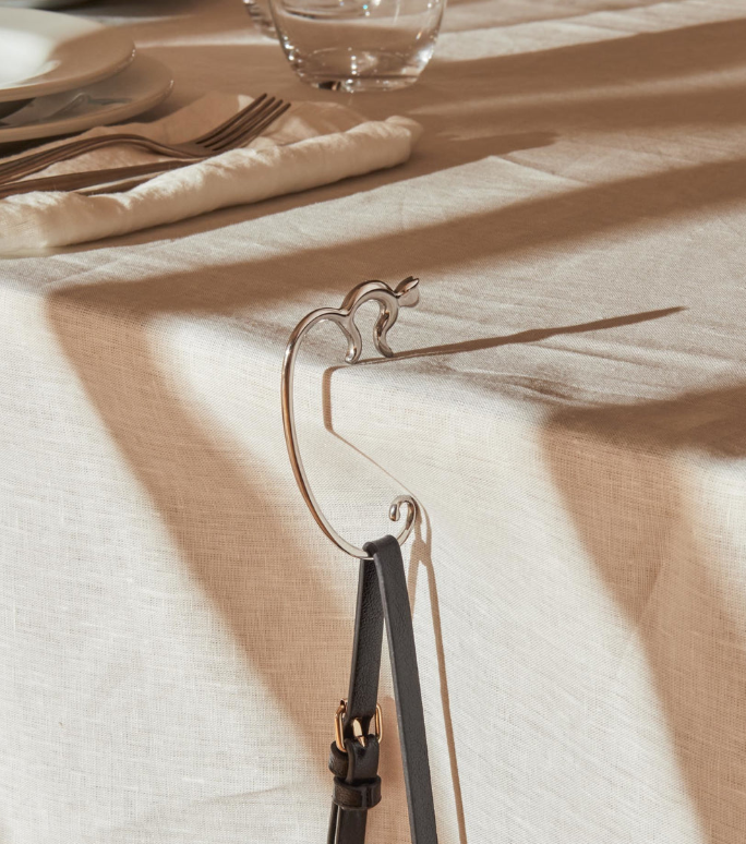 Hauska käsilaukku-koukku pöydän reunaan jossa kissa-hahmo.