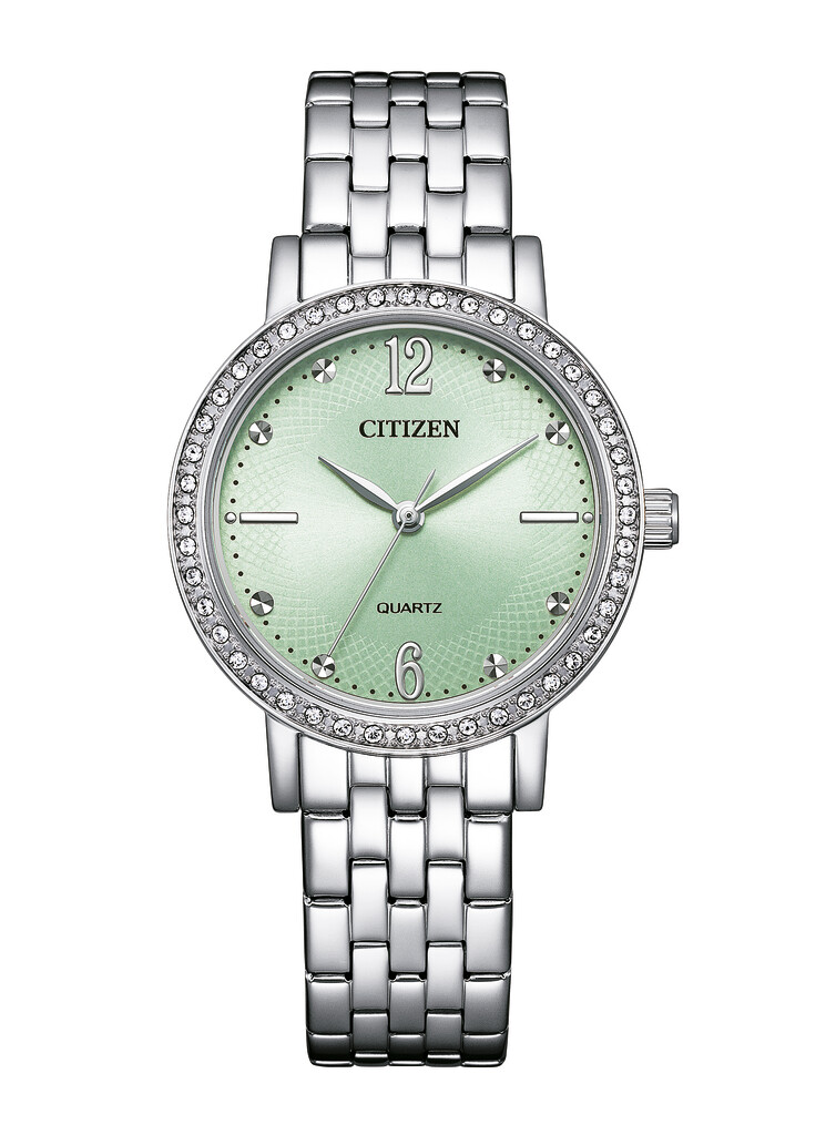 Citizen EL3100-55X on tyylikäs hopeanvärinen naisten rannekello. Kellossa on ruostumattomasta teräksestä valmistettu ranneke sekä 31 mm leveä runko. Tyylikästä vihreää kellotaulua suojaa mineraalilasi, jota kiertää upea zirkoniakehä.