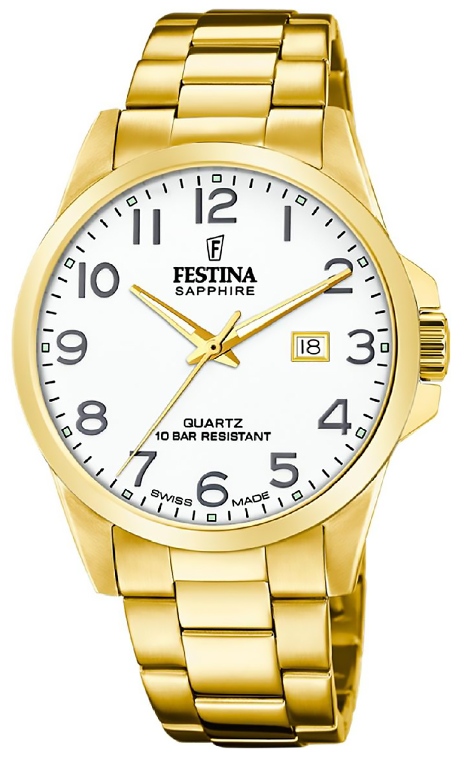 Festina Swiss made F20044 /1 on tyylikäs miesten kullanvärinen rannekello, siinä on selkeä kellotaulu numeroindekseillä.