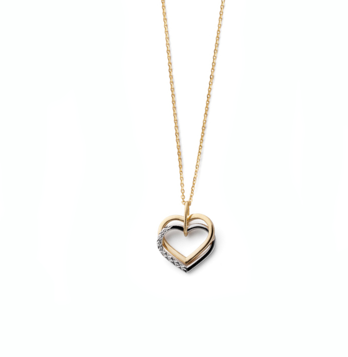 Tyylikäs keltakultainen Tuplasydän-riipus, jossa kaksi sydäntä juotettuna allekkain. Alempi sydämistä on valkokultaa ja koristeltu timanttileikkauksella.