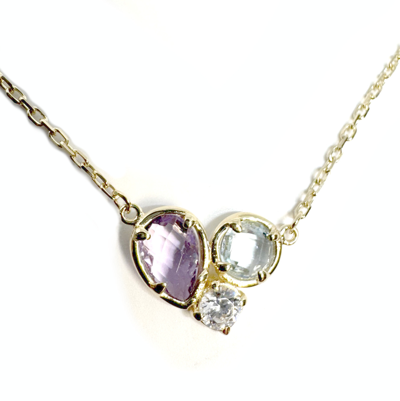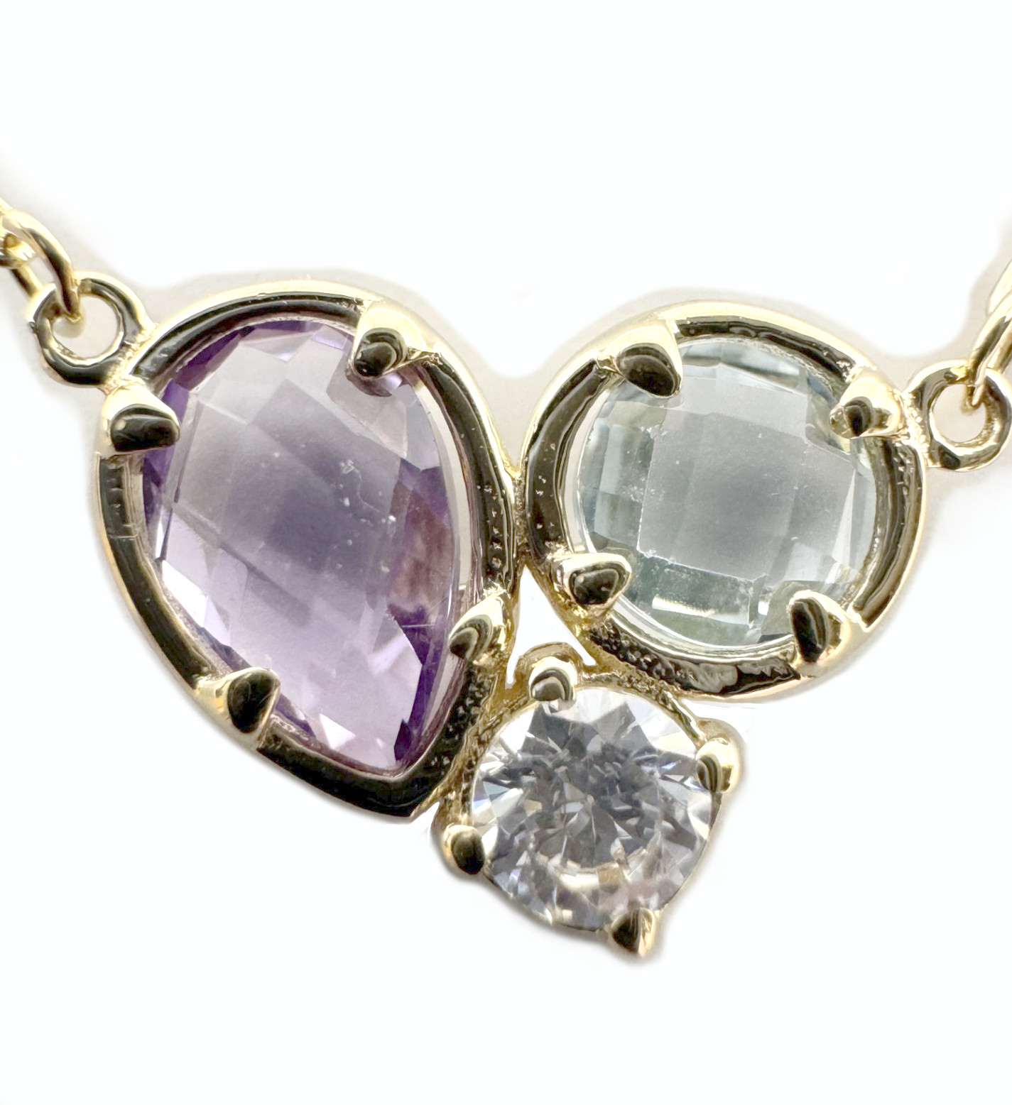 Uniikki monivärinen kaulakoru jossa aidot jalokivet: violetti ametisti ja sininen sekä kirkas topaasi