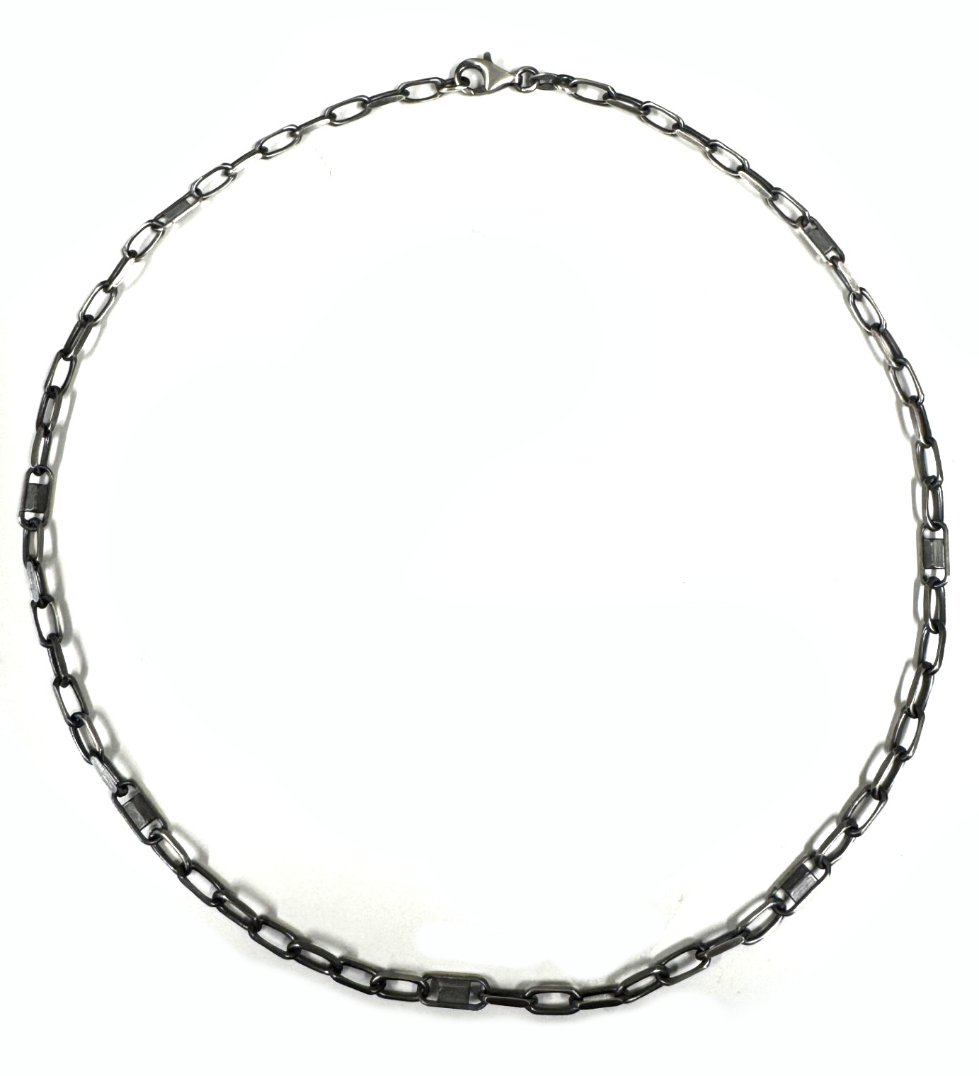 Näyttävä tummennettu hopeinen lenkkiketju, jossa joka kahdeksannessa lenkissä koristepalkki.