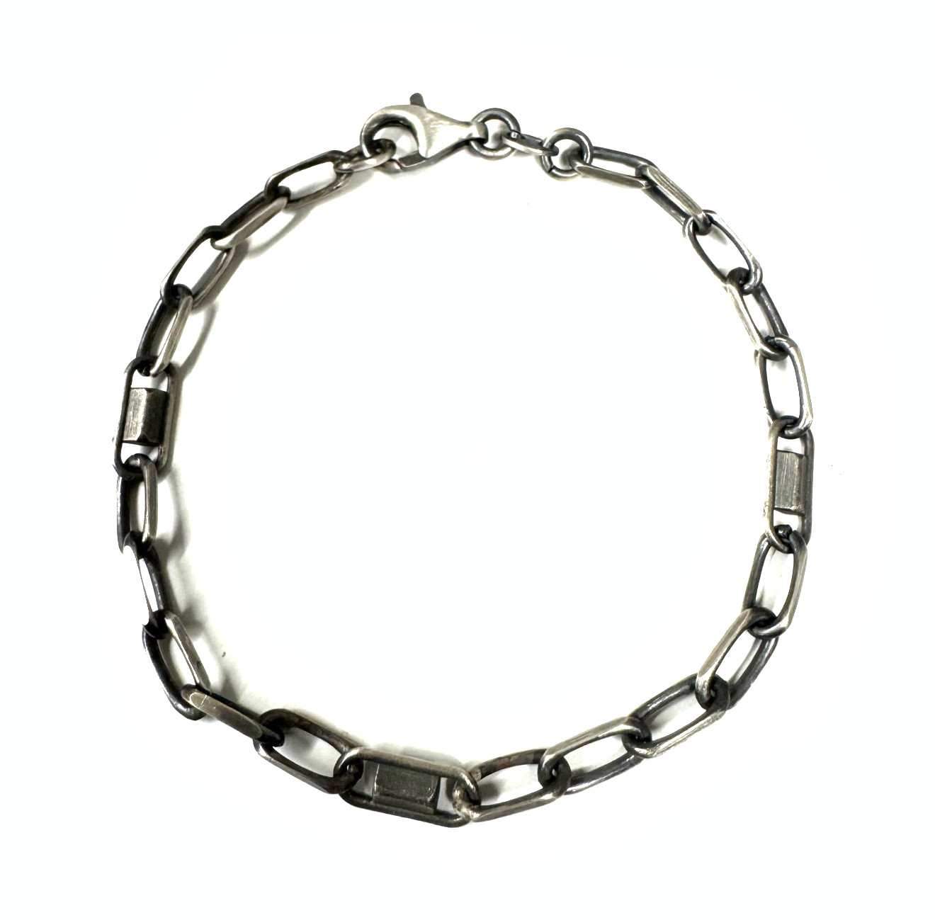 Näyttävä tummennettu hopeinen lenkki-ranneketju, jossa joka kuudennessa lenkissä koristepalkki.