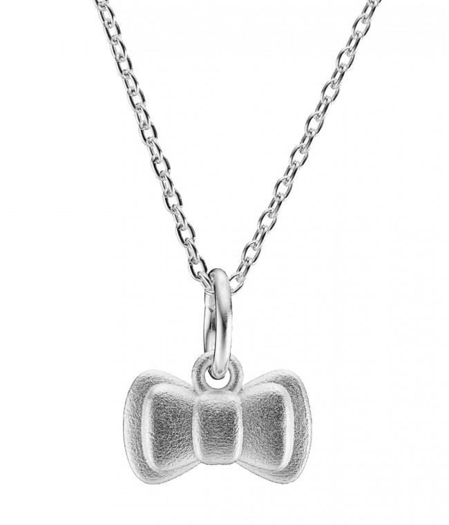 Kaunis hopeinen koru jossa on rusettia esittävä riipus